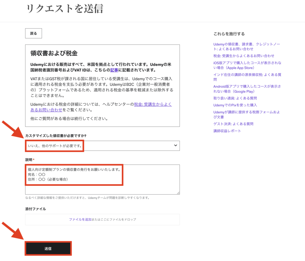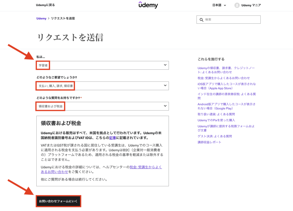 個人向け定額プランで領収書を発行するには、Udemy公式のお問い合わせ窓口から発行手続きをしてもらう必要があります。