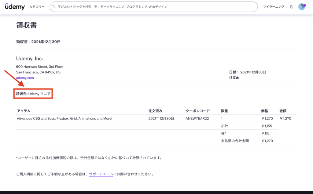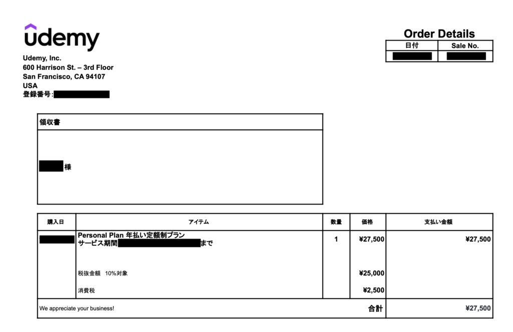 実際にUdemyから受け取った領収書は次のようなものです。