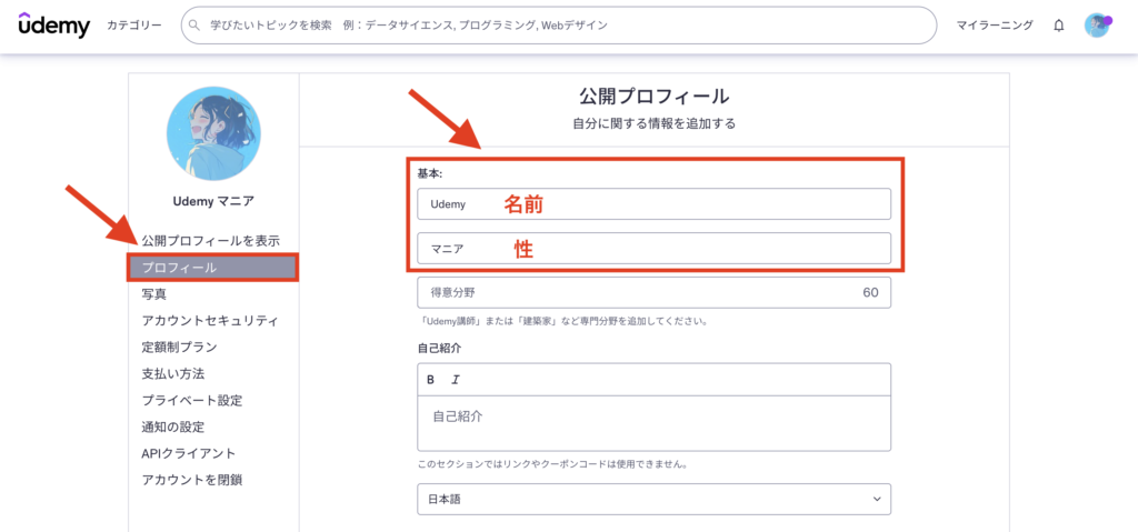 ログインしてUdemyのユーザー名が表示されたのを確認したら、次の項目を埋めていきましょう。