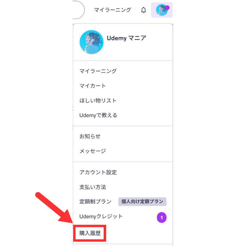 Udemyにログインしたら「プロフィールアイコン」>「購入履歴」をクリックします。