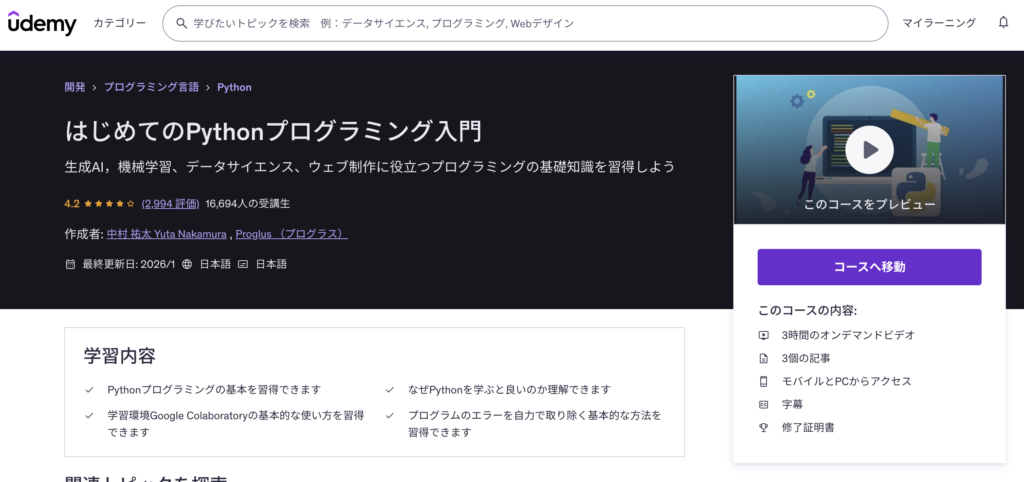 初心者向け講座の中でも、学習のゴールと道筋がはっきりしているため、途中で挫折しやすい人にとって“軸”になりやすい一本と言えます。まずはPythonの全体像をつかみ、学習の土台を作りたい人に向いています。