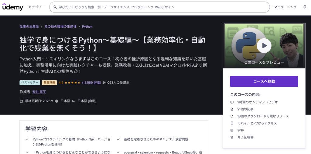 独学で身につけるPython〜基礎編〜【業務効率化・自動化で残業を無くそう!】は、Pythonをまったく触ったことがない初心者が「何から学べばいいのか分からない」状態を抜け出すための、全体設計に強みがあります。