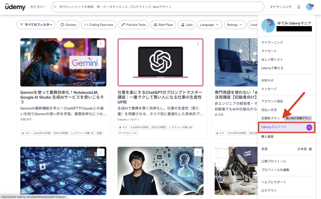 Udemyクレジットの残高は「プロフィールアイコン」>「Udemyクレジット」から確認できます。