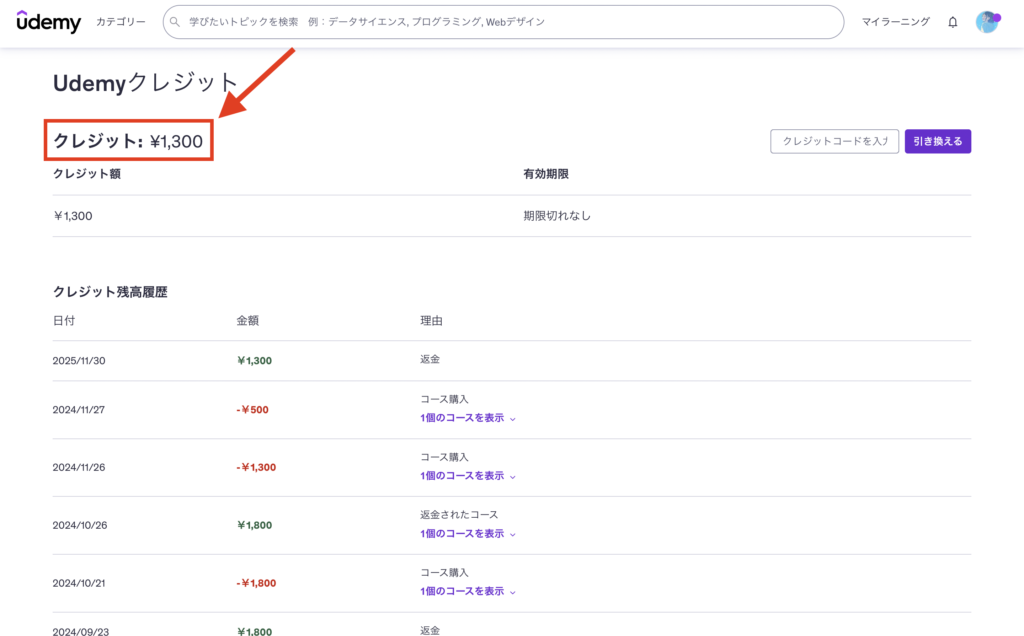 現在のUdemyクレジット残高、有効期限、また過去の残高履歴も確認できます。