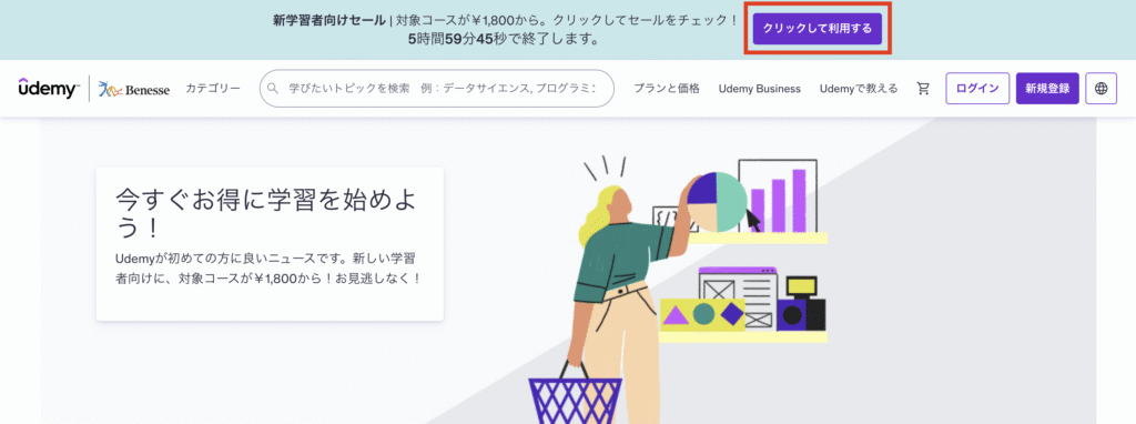 先ほども紹介しましたが、Udemyの新規受講生割引を利用するには、バナーに表示されている「クリックして利用する」のボタンで適用させる必要があります。
