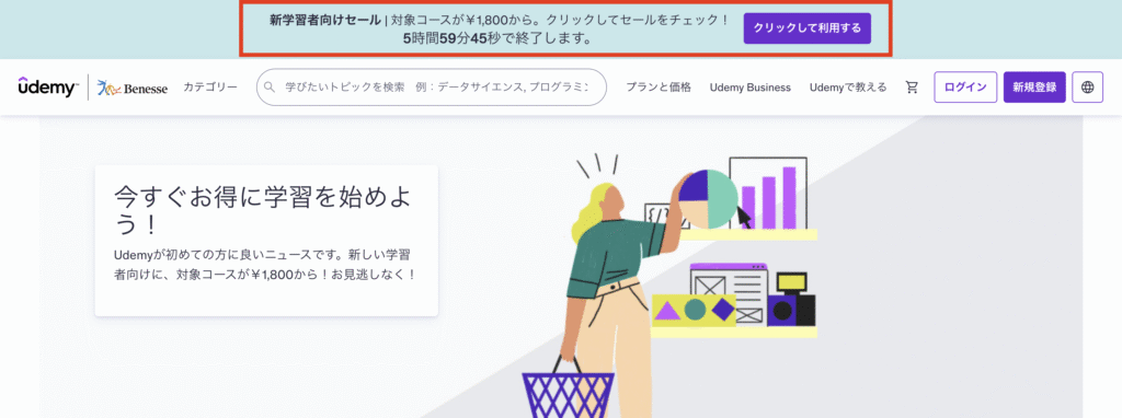 Udemyの「新規受講生割引」は、Udemyを初めて使う人だけに提供される“ウェルカムセール”のような仕組みです。
