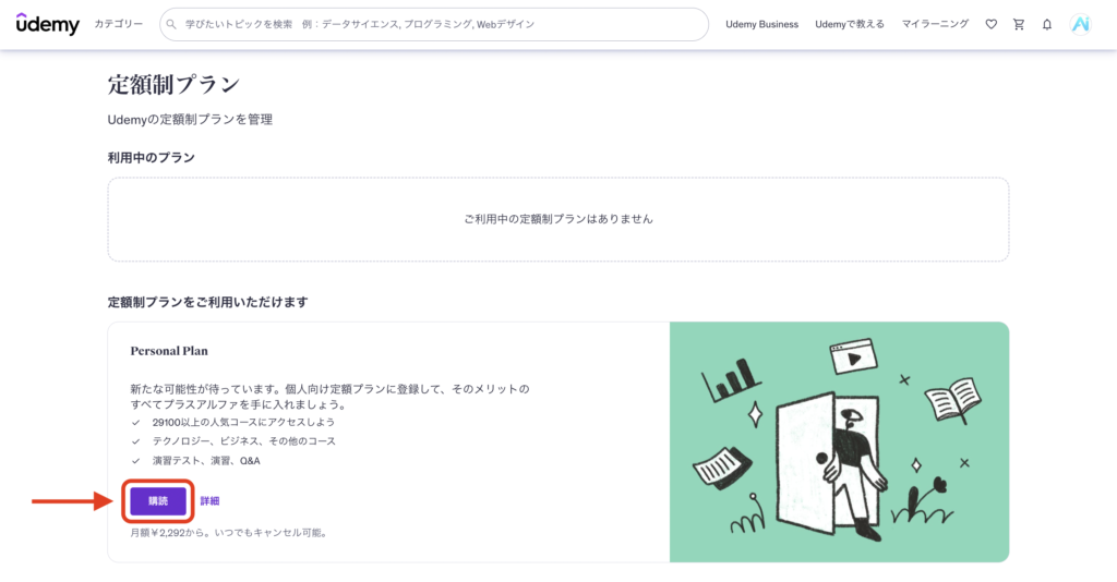 Udemy学び放題は、月額または年額で利用できる定額制プランです。