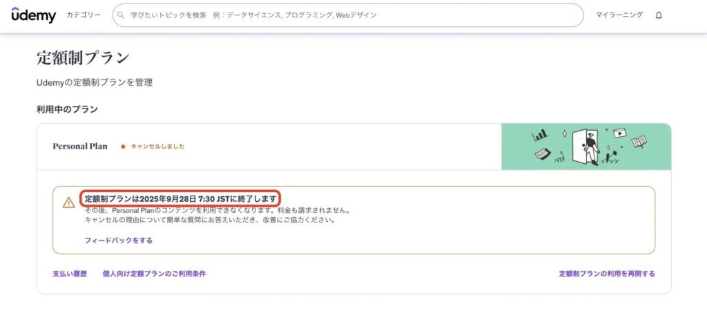 Udemy学び放題の契約期間が終了すると、